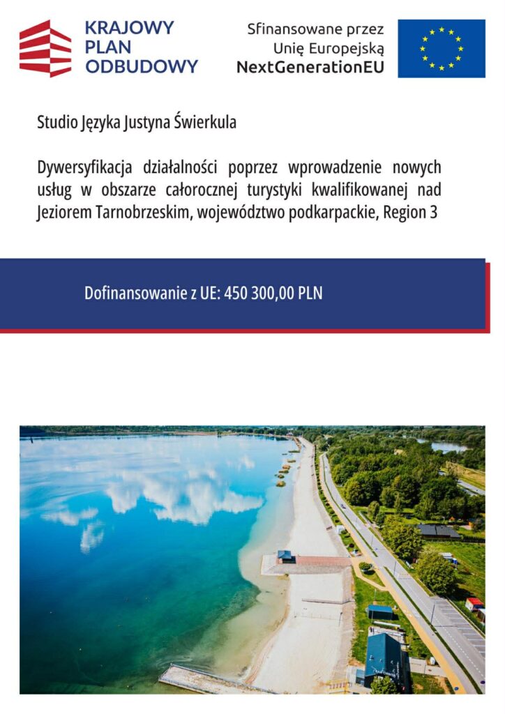 Studio Języka Justyna Świerkula realizuje projekt objęty wsparciem w ramach Inwestycji A1.2.1 „Inwestycje dla przedsiębiorstw w produkty, usługi i kompetencje pracowników oraz kadry związane z dywersyfikacją działalności”, Krajowy Plan Odbudowy i Zwiększania Odporności, Priorytet Odporność i konkurencyjność gospodarki – część grantowa.
